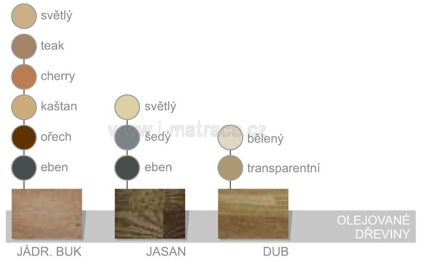 Postel se vyrábí ve dvou variantách dřevin: Jádrový buk a dub. Dřevinu jádrový buk lze vyrobit i v barevném provedení: světlý, teak, cherry, kaštan a eben. Požadovaný odstín prosím uveďte do poznámky při vyplňování fakturační adresy