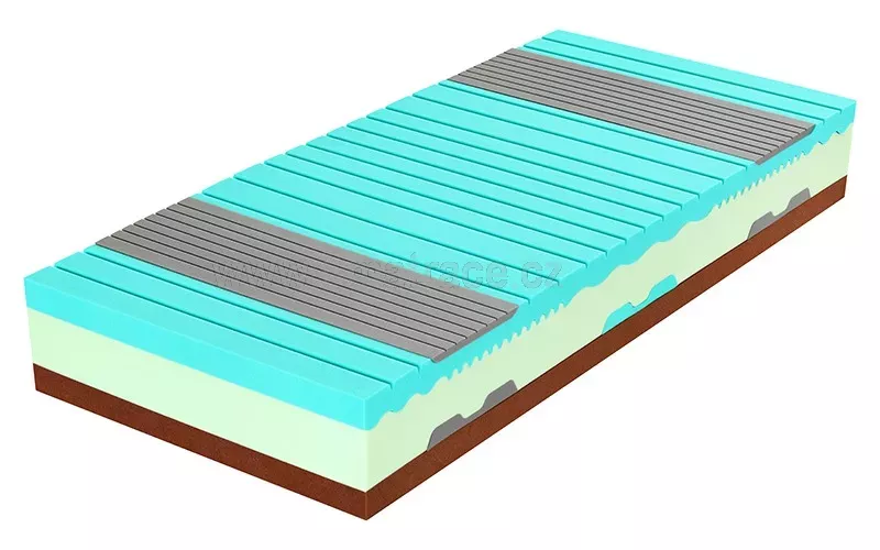 Třístupňová kostrukce - odrazová pružnost se zvyšuje v každé vrstvě nejmodernějších pěn velmi vysoké objemové hmotnosti s nejvyšší možnou propustností vodních par. Úžasně pohodlná a stabilní konstrukce.