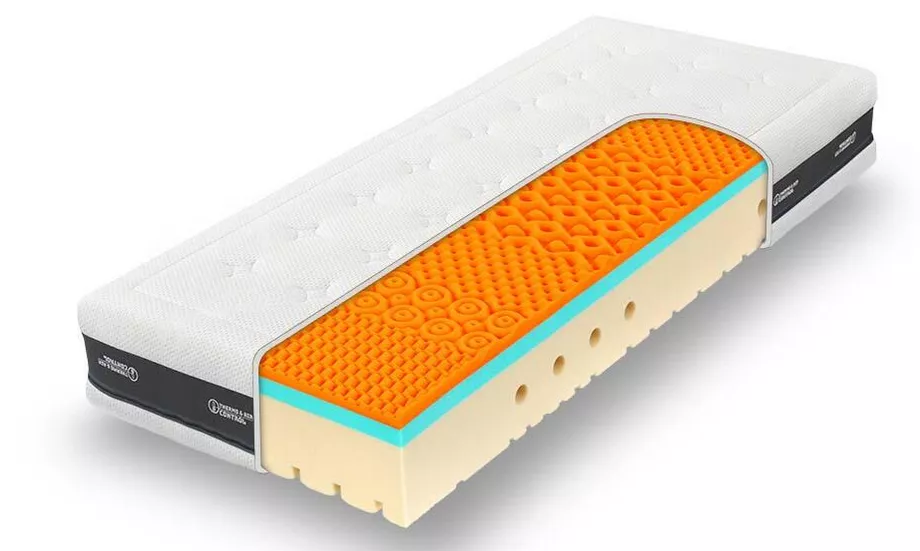 Paměťová (visco) pěna (oranžová vrstva) - vyrobena za použití přírodních surovin; lepší elasticita a antialergické vlastnosti. Super pohodlná, uleví kloubům.
