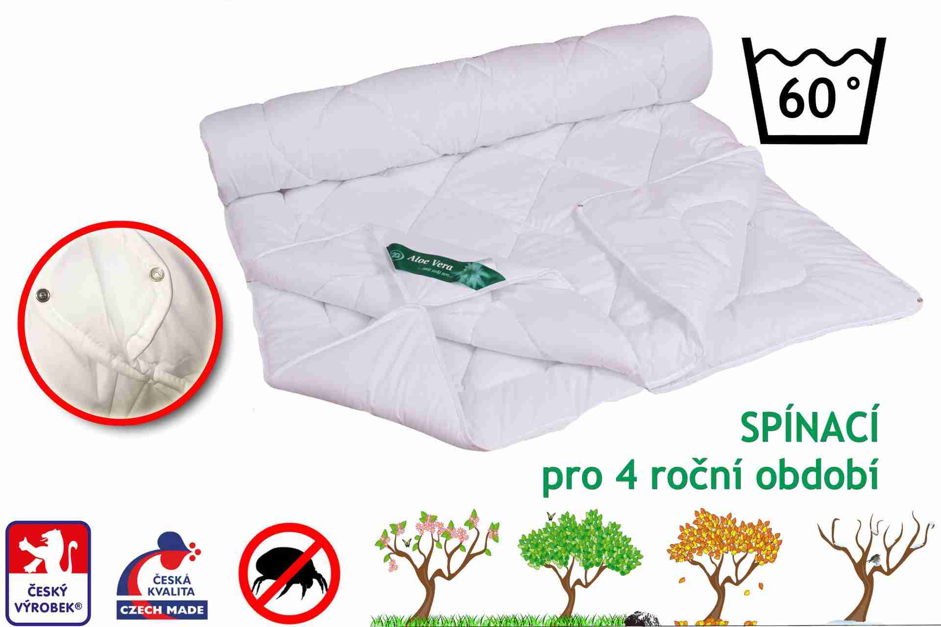 Spínací, nadýchaná a heboučká přikrývka s obsahem výtažků Aloe Vera. Příznivě působí na pokožku, zmírňuje bolesti svalů a kloubů a redukuje výskyt bakterií a hub. Spínací přikrývka je tvořena dvěma přikrývkami, přičemž každá má jinou hmotnost. Na léto použijete lehčí, na podzim/jaro tlustší a na zimu je připnete k sobě pomocí druků a vznikne nejteplejší přikrývka.