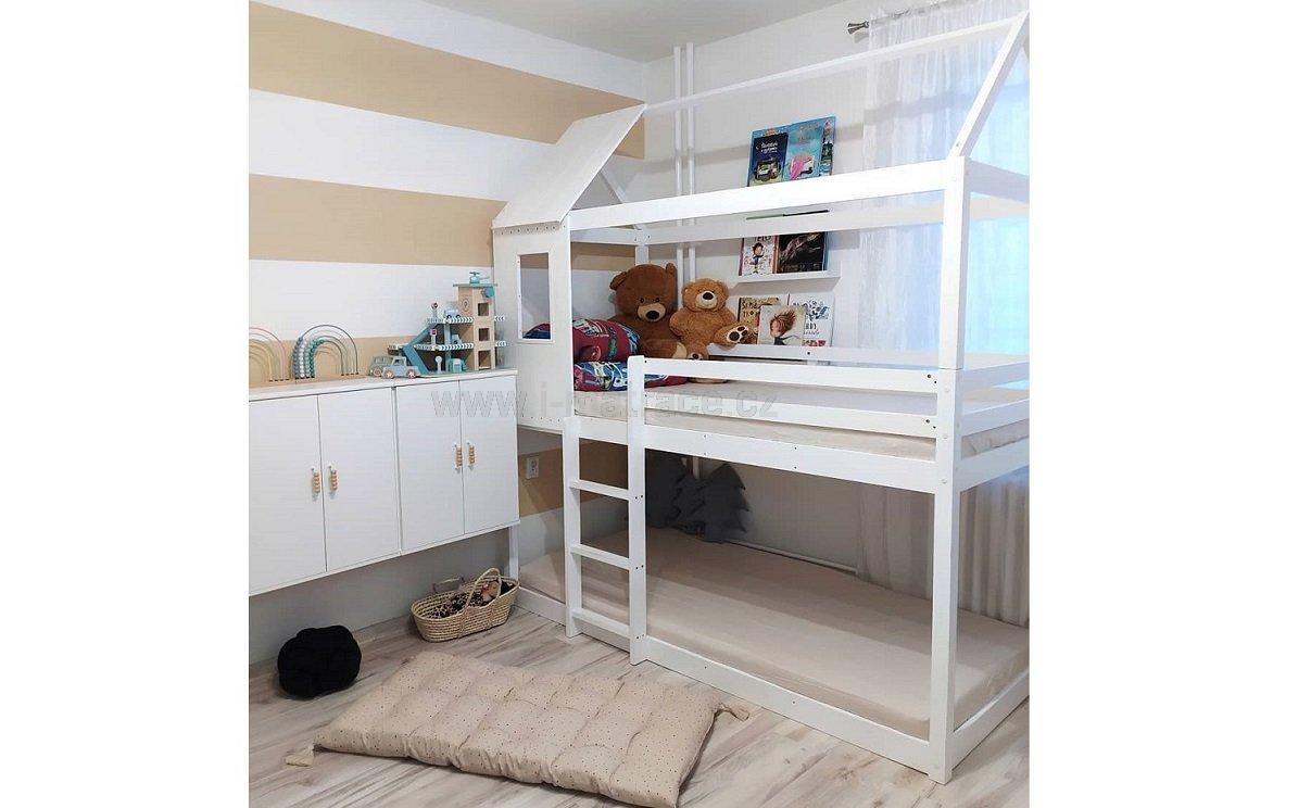 K posteli je připevněný žebřík a stěna domku s okýnkem. Horní lůžko je zabezpečené proti pádu dřevěnou zábranou.