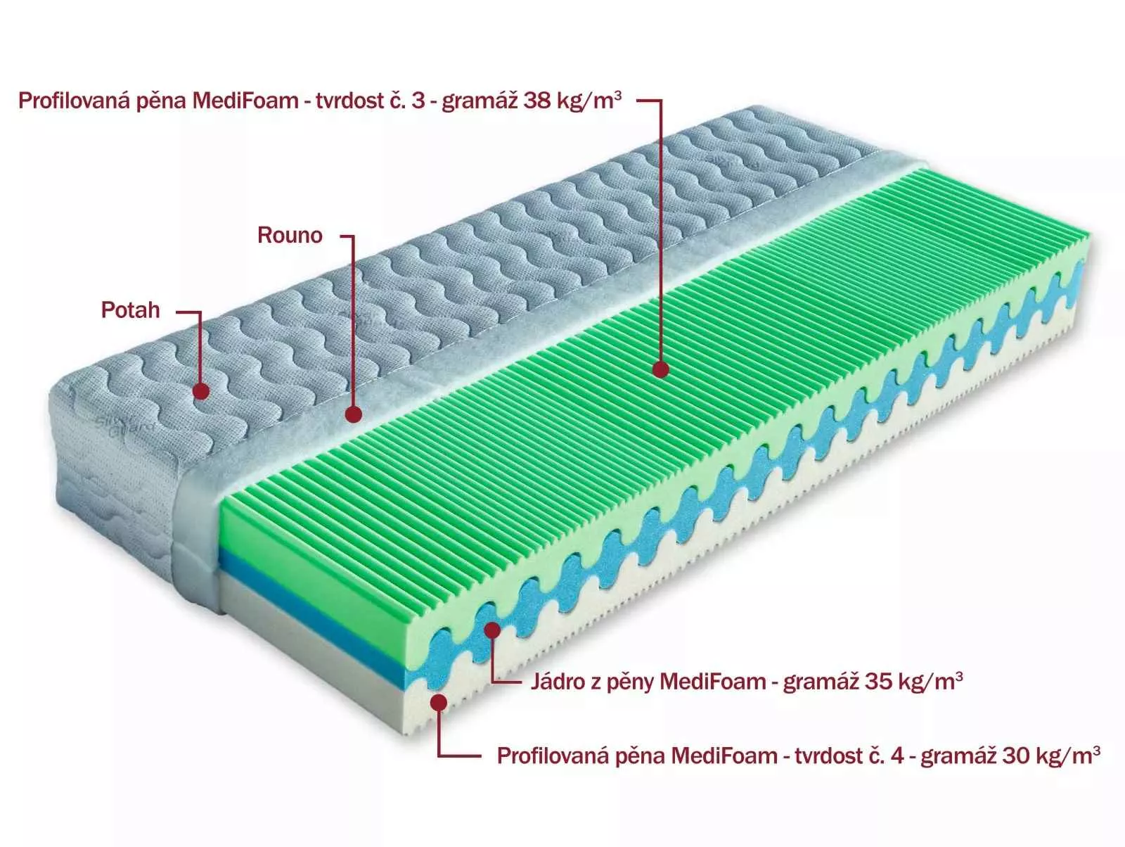 Vrchní vrstvy jsou tvořeny vysoce gramážní pěnou Medifoam o objemové hmotnosti 38 a 30 kg/m³. Tyto odolné a pružné pěny jsou spojené středem s pevným vlnkovým jádrem o objemové hmotnosti 35kg/m³ bez použití lepidla.