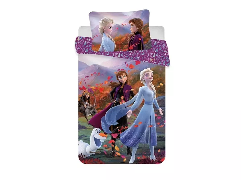 Oblíbené postavy z filmu Frozen 2 - Elsa, Anna a veselý sněhulák Olaf ? ožívají na jemně růžovém pozadí s motivem padajícího listí. Povlečení vytváří teplou a útulnou atmosféru, která zpříjemní každé usínání. Díky živým barvám a detailnímu potisku se stane oblíbeným doplňkem každé dětské postýlky.
