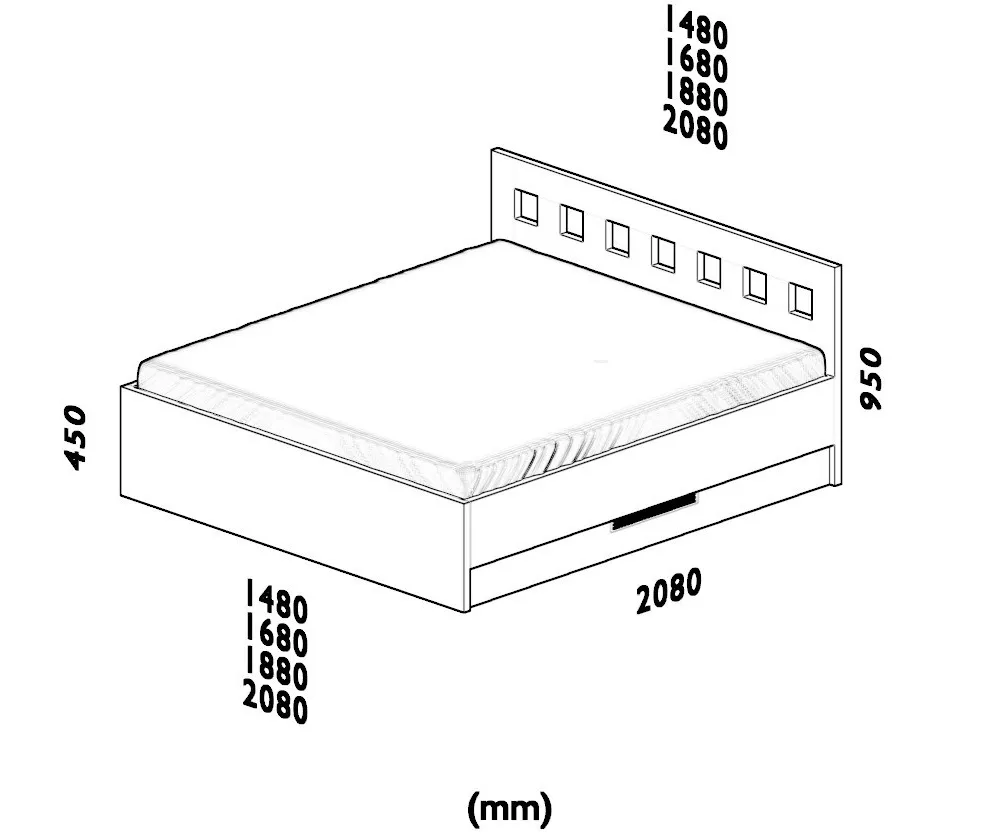 Rozměry postele jsou navrženy s ohledem na komfort a funkčnost. Celková výška čela je 95 cm, horní hrana bočnice je ve výšce 45 cm a pozice pro uložení roštu je 30 cm od země. Postel je určena pro dvojlůžka s možností vložení 2 roštů a 2 matrací. Stabilitu zajišťuje střednice se středovou nohou u postelí šíře 140 cm a více.