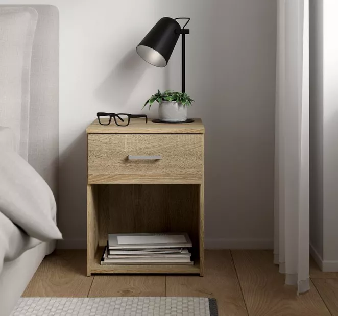 Noční stolek Sid představuje moderní a nadčasové řešení pro vaši ložnici. Svým jednoduchým designem a čistými liniemi dokonale zapadne do jakéhokoliv interiéru ? od klasického až po minimalistický. Stolek je součástí kolekce Sid, která zahrnuje také komody a šatní skříně v různých velikostech, takže si můžete snadno vytvořit harmonicky sladěný ložnicový set.