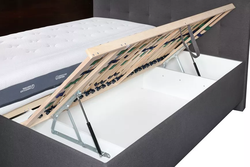 Postel Venuše představuje elegantní a praktické řešení pro moderní ložnice. Její čalouněná základna ve tvaru boxu zajišťuje pevnost, stabilitu a dlouhou životnost. Každý box je vybaven odvětrávaným úložným prostorem, který je snadno přístupný pomocí bočních výklopných roštů s plynovými vzpěrami. Tento systém umožňuje pohodlné otevírání i při každodenním používání.