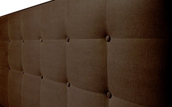 Čelo postele je zhotoveno z DTD 16 mm. Tloušťka čela je opticky po obvodu rozšířená páskem MDF o šířce 9 cm a tloušťce 6 mm. Čelo je rozděleno na 18 obdélníků, v průsečících je osazené 10 ozdobných knoflíků o průměru 25 mm. Je vystláno polyesterovým rounem. Zadní část je začištěna netkanou černou textilií.