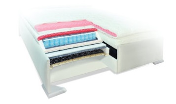 - Pružinová vložka 190x75x8 cm s drátem o síle 2,2 mm. Navrchu a po obvodu pružinové vložky je použit polyuretan. Proti protlačení pružin je použita technická textilie s vpichovaným polypropylenovým vláknem Matrace je očalouněna v technické látce a změkčená polyesterovým rounem.