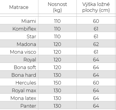 Nosnost - dle typu úložného prostoru a matrace.
