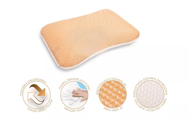 Velkou výhodou je moderní, prodyšné provedení potahu. 3D úplet se strukturou Aero Mesh podporuje cirkulaci vzduchu, takže polštář působí svěže i při každodenním používání. Exkluzivní žakárový úplet navíc dodává polštáři elegantní vzhled.