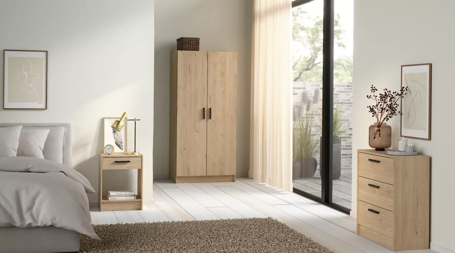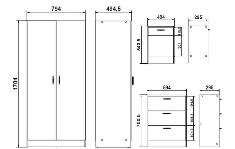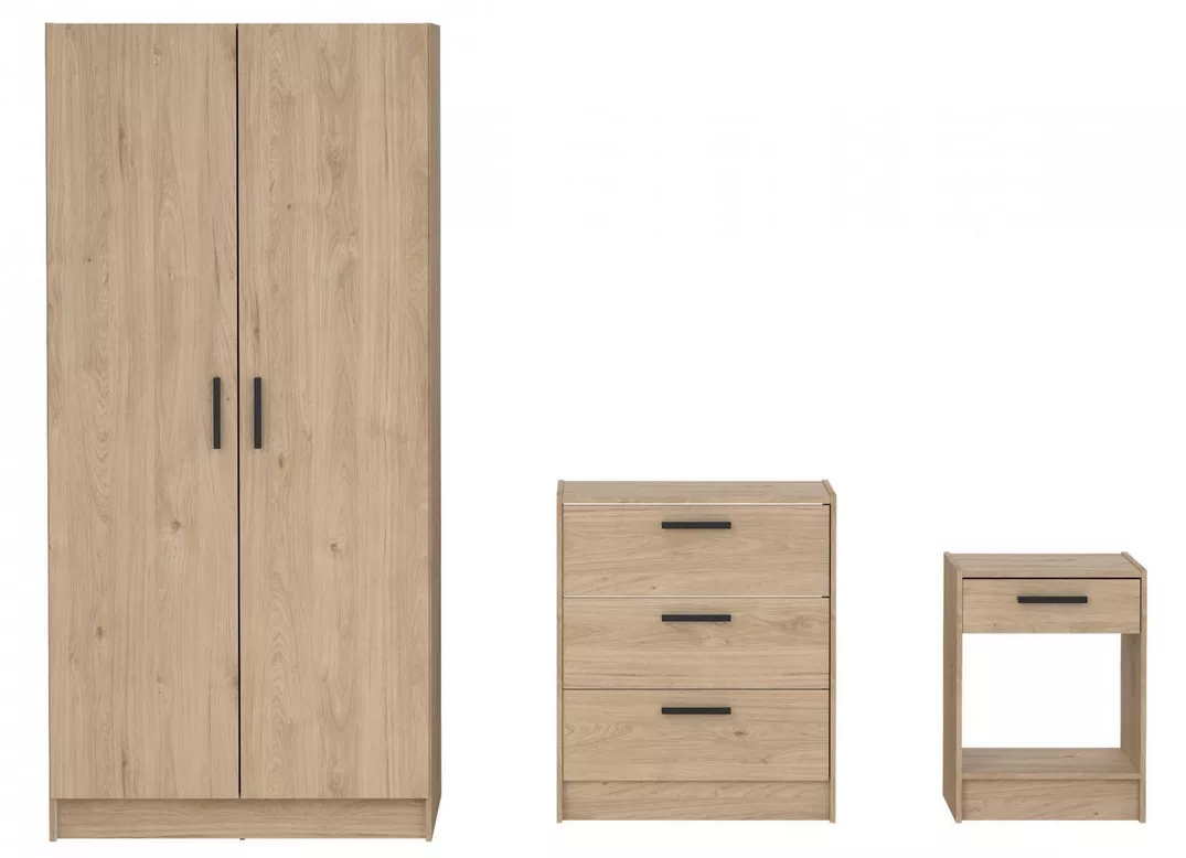 Sestava Start 077 je praktické řešení pro ložnici, studentský pokoj i menší byt, kde chcete sladěný nábytek v jednom stylu. Kombinuje šatní skříň, komodu a noční stolek do uceleného setu, který působí čistě, moderně a zároveň nepřeplácaně. V praxi oceníte hlavně to, že základní úložné potřeby vyřešíte jedním nákupem ? oblečení do skříně, drobnosti do komody a vše potřebné na noc po ruce ve stolku.