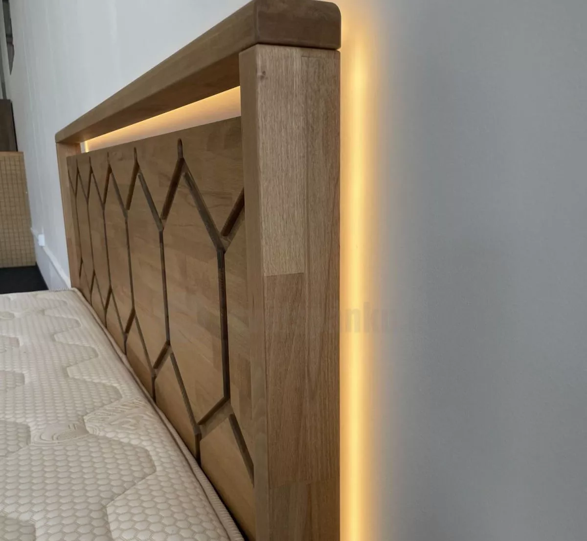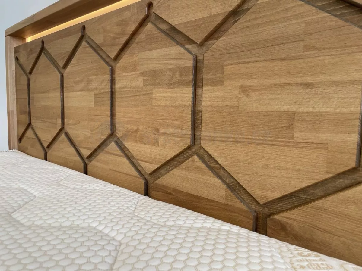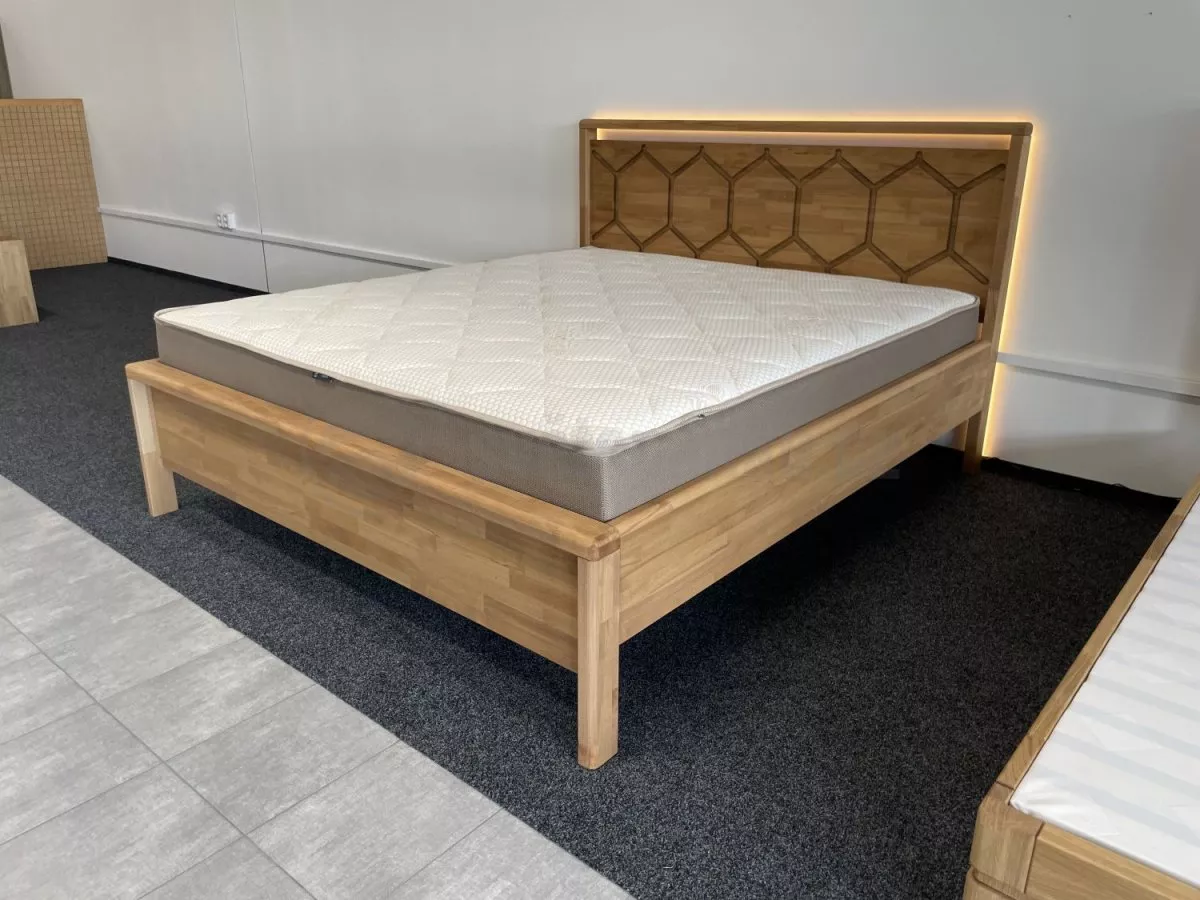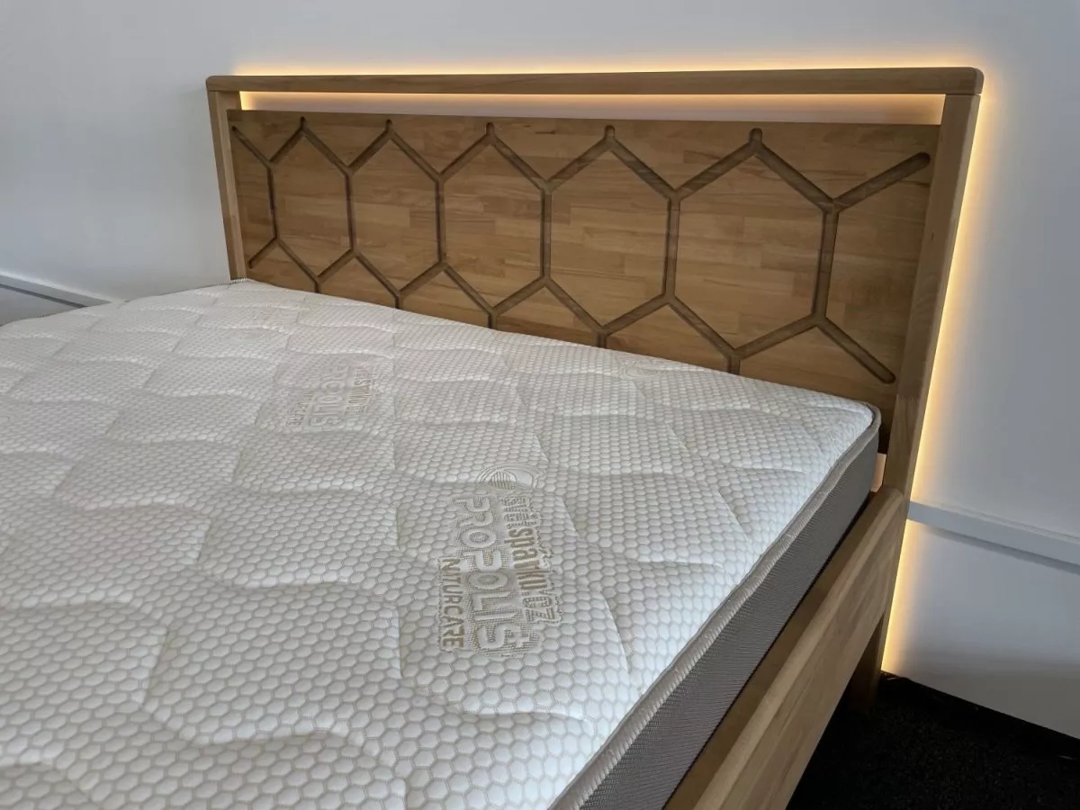 Postel CASTELLO LED zaujme na první pohled výrazným čelem s originálním motivem inspirovaným strukturou včelích pláství, který dodává ložnici osobitý charakter a moderní eleganci. Precizní zpracování a masivní konstrukce vytvářejí pevný a stabilní základ pro kvalitní a klidný spánek. Tato postel není pouze funkčním kusem nábytku, ale výrazným designovým prvkem, který přirozeně dominuje prostoru.