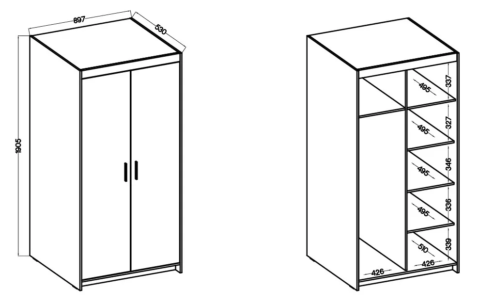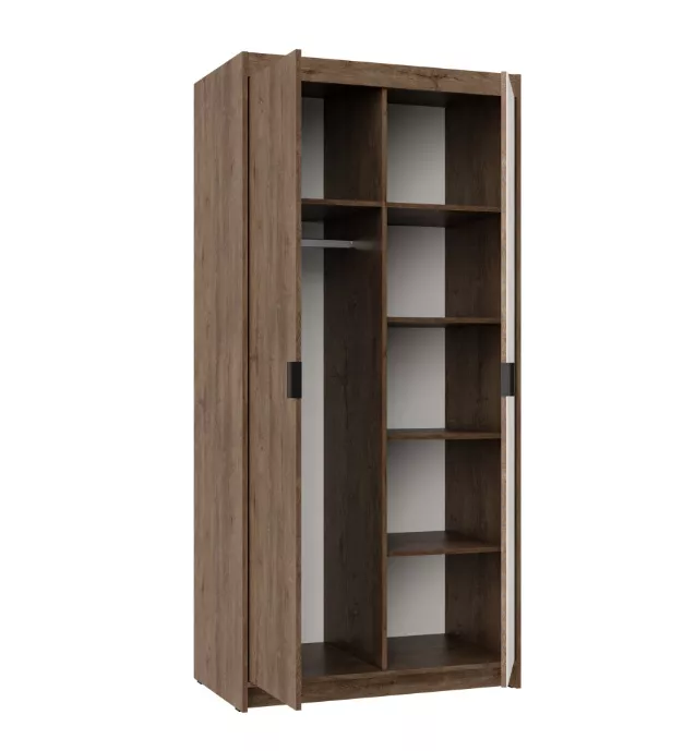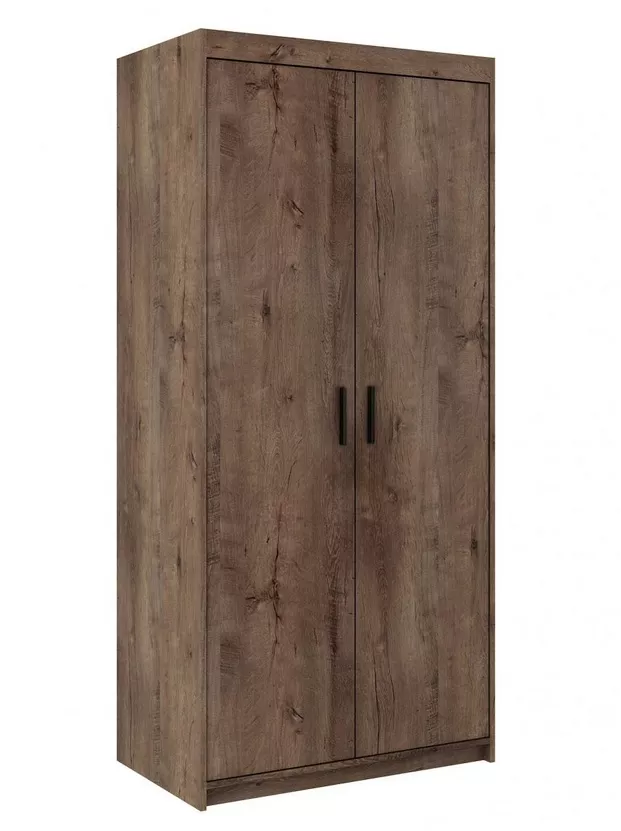 Šatní skříň Enja 2D je praktická skříň o šířce 90 cm, která nabízí přehledné uspořádání pro zavěšené i složené oblečení. Díky kombinaci šatní tyče a polic se hodí do ložnice, předsíně i dětského pokoje - všude tam, kde chcete mít věci uklizené a dobře dostupné. Uvnitř najdete celkem 5 polic, které usnadní organizaci oblečení, prádla, krabic nebo doplňků.