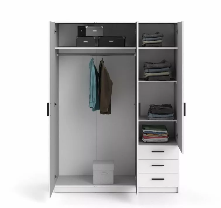Šatní skříň Spike 085 je praktická volba pro každého, kdo chce mít oblečení i drobnosti přehledně uložené na jednom místě. Díky šířce 147 cm nabízí dost prostoru do ložnice, dětského pokoje i předsíně. Uvnitř najdete šatní tyč na zavěšení oblečení a nastavitelné police, které si snadno přizpůsobíte podle toho, co právě potřebujete ukládat. Velkým bonusem jsou také tři zásuvky - ideální na spodní prádlo, doplňky nebo věci, které chcete mít rychle po ruce.