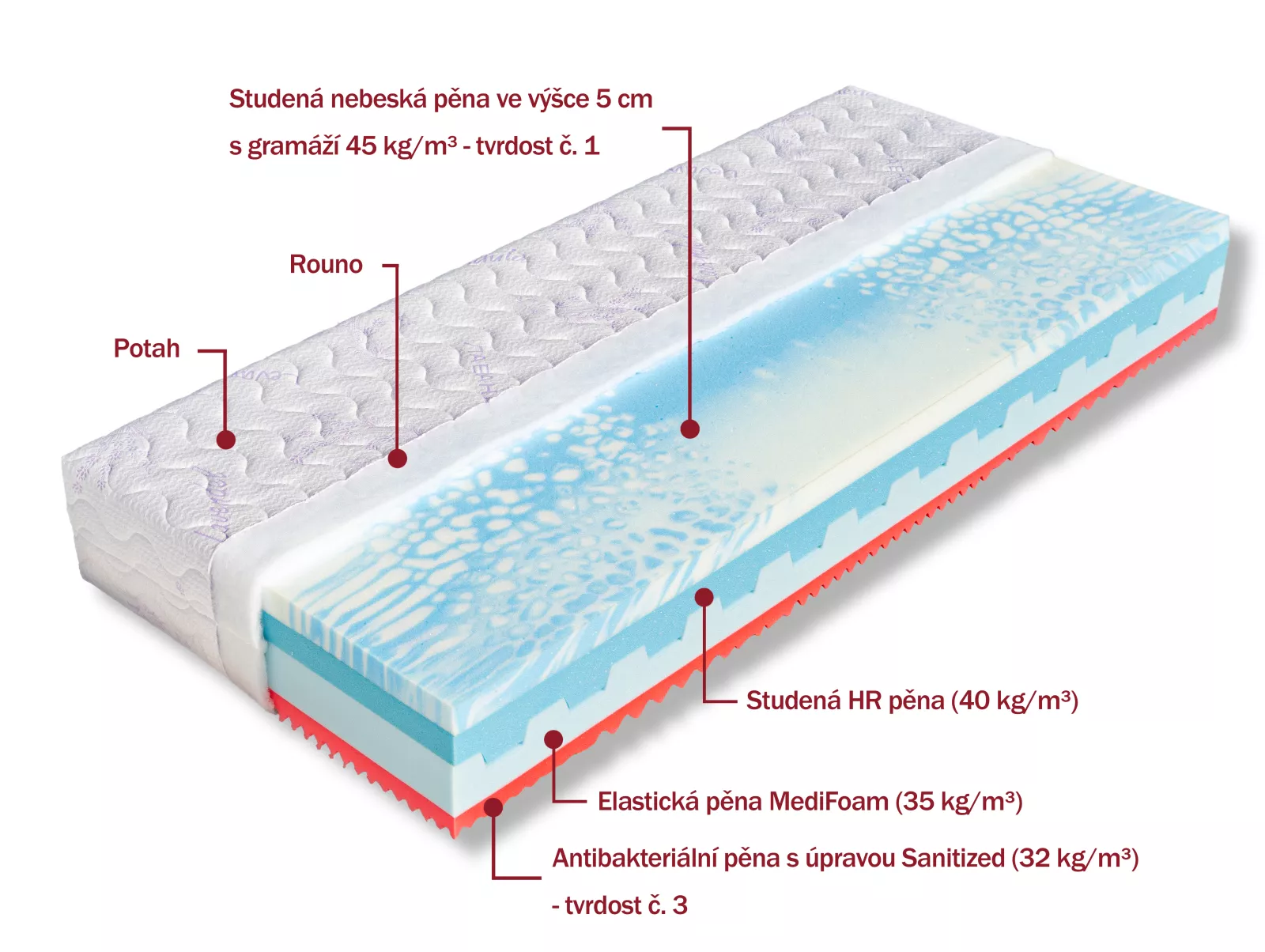 Nebeská pěna je velmi poddajná studená pěna s hustotou 45 kg/m³. Vyznačuje se mimořádnou měkkostí a jemným, příjemným povrchem. Díky své struktuře se plynule přizpůsobuje tvaru těla a nevytváří zpětný tlak, což přispívá k pocitu lehkosti a uvolnění při ležení.